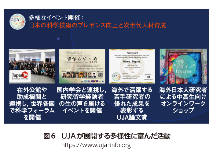 UJA発足後,さまざまな活動を立ち上げてきた(図6).2013年にはじまった分子生物学会での“留学のすゝめ!”イベントは,今は定番となり,たくさんの方と出会い,現在留学中もしくは留学から帰国したばかりの研究者の生の声を伝える場となった.留学についての大規模アンケートでは,留学体験と意見を集約し,500名を超える方からの貴重な資料として,政府の方に留学の現状とニーズを届けた.現在,2度目のアンケートを実施し,研究者の方々への参考資料としてだけではなく,国の政策へお役立ていただくべく取り組んでいる.2015年には実験医学とのコラボにより,留学体験記リレーを行い,山中伸弥先生をはじめ100名を超える方から,留学体験を綴っていただいた.当初は3回の連載企画であったが,留学を3回で語るのは不可能とし,全8回の連載となった.実験医学編集部の心意気とご支援に感謝している.執筆された方の“体験・学びを伝えたい”思いが,どの寄稿からもにじみ出てたいへんな好評をいただいた.この留学体験記がもととなり,留学のすべてのステップをまとめた『研究留学のすゝめ!』が2016年に刊行された.この本を読んで留学を決意したという声や,役に立ったとの声が寄せられ,すべての労が吹き飛んだ記憶がある.