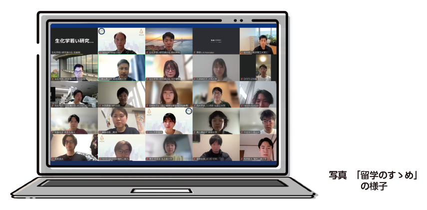 海外日本人研究者ネットワークUJAは,UJA大会の活動の一環として,生化学若い研究者の会およびco-Lab BRAINSと共催で「留学のすゝめ~君の可能性は無限大~」を開催した.生化学若い研究者の会は,生命科学分野に関心をもつ若手研究者による,若手研究者のためのコミュニティであり,専門分野や所属を越えたネットワークづくりをめざしている.co-Lab BRAINSは,研究者同士,また研究者と市民をつなぐ相互コミュニケーションの場としてアズワン株式会社により立ち上げられたメディアサイトである.当日はオンラインでの開催となり,大学生や大学院生を中心に50名が参加した(写真).イベントは,登壇者3名による留学経験やその後のキャリアに関する講演を中心に進行された.