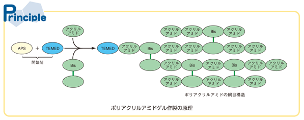 ポリアクリルアミドのゲルは,ラジカル連鎖重合という化学反応によって作られる.その反応の詳細に関しては次回に解説するが,過硫酸アンモニウム(APS)とN,N,N´,N´- テトラメチルエチレンジアミン(TEMED)による開始剤がアクリルアミドと反応し,さらに連鎖的にアクリルアミドが順次反応することによりポリマーとなる.アクリルアミドだけでは直鎖状のポリマーになってしまうが,二価性架橋剤のN,N´- メチレンビスアクリルアミド(Bis)(2つのアクリルアミド分子がメチレンを介して連結した分子)を反応中に加えることにより,枝分かれした三次元構造のポリマーになる(Principle).