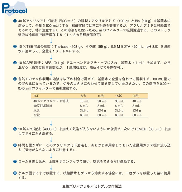 ゲル作製の時間短縮にTEMEDを多くしてしまうと,結局は泳動に時間がかかってしまい,おまけに各RNA断片のバンドも拡散してしまう. 再現性のある結果を出すためには,常にプロトコル通りに実験を行うことが重要であることがおわかりいただけただろう.次回(実験医学2008 年4月号)は電気泳動における変性剤としての尿素の役割について解説したい.