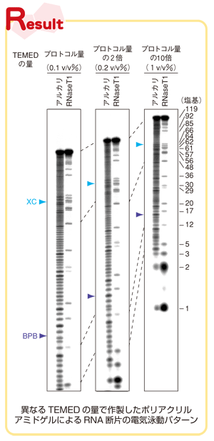 泳動するサンプルは, 5 ′末端を32P で標識した119塩基のRNA断片を,アルカリ(配列中のすべてのヌクレオチドの3′末端側でRNA断片を切断)とRNaseT1(配列中のG の3′末端側でRNA断片を切断)のそれぞれで処理して限定分解したものを用いた.これらのRNA溶液を等量の10 M 尿素と0.025 %のキシレンシアノール(XC)とブロムフェノールブルー(BPB)を含む1× TBE 溶液と混合し,これを75 ℃で1分間加温した後にゲルにロードした.循環水層を装着した電気泳動装置を用いて45 ℃に保ち,35 ワットで1.5 時間泳動し,IP プレートを用いてBAS2500(富士フイルム社製)で解析した(Result).一定の電力(35W)で電気泳動を行ったが,1.5 時間後のそれぞれの電気泳動での電圧と電流は,0.1 v/v % TEMEDで作製したゲルが1515 V,23 mA,0.2 v/v % TEMEDの場合が1405 V,25 mA,1 v/v % TEMEDの場合が1119 V,31 mA であった.