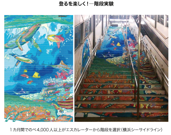 また別の事例では横浜市から,健康づくりのため交通機関の階段利用を促進したい,と相談を受けた.健康行動の利益を訴求する健康階段(理性型),見た目デザインの美しさを楽しむ階段水族館(感性型)の2種類の階段を設置,利用度評価を行ったところ後者の方が効果が顕著であることが明らかとなった(参考5).