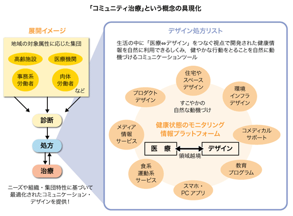 こうした取り組みの本格化には,人材育成,実証実験,商品実装の流れを継ぎ目なく実行することが考えられる.このためには課題認識を共有する産官学連携の共同体でデザインラボを設置することが有効と思われるし,最終的には有効な方法論を結集させた「まちづくり」などマクロ視点へと軸足を移すことで,自治体連携で持続可能な体制づくりも実現できるだろう.デザインの視点から,疾病予防を実現する全く新たなコミュニケーション体系,いわば「コミュニティ治療」ともいうべき概念が具現化できれば,今後の日本,世界を救うきわめて重要な領域となるのではなかろうか.