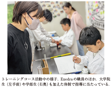 科学館は博物館の一種であり,博物館には,資料の収集と保存,調査と研究,展示と教育の3つの機能があるとされている.Exedraは調査・研究機能の充実をめざして,2022年4月から,小中学生を研究者に育てる「研究部」の活動を開始した.初年度は10人,2年目は24人,3年目の現在は12月末時点で57人の部員が毎月2回,活動している.小学2年生はプレコース,3年生以上はトレーニングコースから活動を始め,ノートの取り方や実験器具の使い方,研究に向き合う態度や考え方などを身に着ける(写真).トレーニング修了後は,与えられた研究テーマに取り組みながら研究を体験するステップアップコース,さらに自ら問いを立てて自立して研究するチャレンジコースへと進む.ステップアップ以上のコースでは,鳥の骨の化石化に挑戦してその初期のプロセスを再現したり,深海魚を解剖してマイクロプラスチックを発見したり,彗星の分光観測に取り組んだり,植物から取り出した繊維で紙を作り,自作のインキで紙とインキのレシピを自ら印刷したりと,多様な研究を行い成果をあげつつある.
