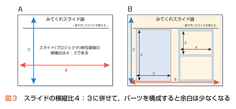 スライドの映写範囲はたいてい800×600か1024×768ドット,つまり横縦比は4:3である (図3A).スライドを作成するときはこのことをしっかりと頭に入れておかなければならない.横縦比が4:3のスライドにパーツを入れるときには,図3Bのように,そのパーツも基本的に4:3,2:3(あるいは8:3というのもときにはありうる) の横縦比で構成するようにする.そんなパーツを入れ子にして配置することで,スライドの余白を減らすことができる.