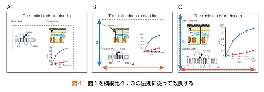 最初に示した図は,横縦比4:3を頭に入れてパーツの配置を工夫すれば余白を減らすことができる.この図のパーツをよく見てみると,図4Aの点線で示したように配置の全体構成が四角形になっていない.これではどうしたって余白ができてしまう.そこで,パーツの中身を変えず配置だけを4:3の横縦比の四角形内に収まるように変えてみると図4Bのようになる.これでパーツはまとまったが,余白の広さは以前と変わらない.次に,横縦比4:3の点線四角形を拡大させながら,併せて各パーツを限界まで大きくする (図4C).これで,余白の少ない,十分に見やすい大きさのパーツで構成されたスライドが完成する.余白を憎んで,4:3の横縦比を頭に入れておくだけで,それなりに見やすいスライドはこのように簡単に作成することができる.