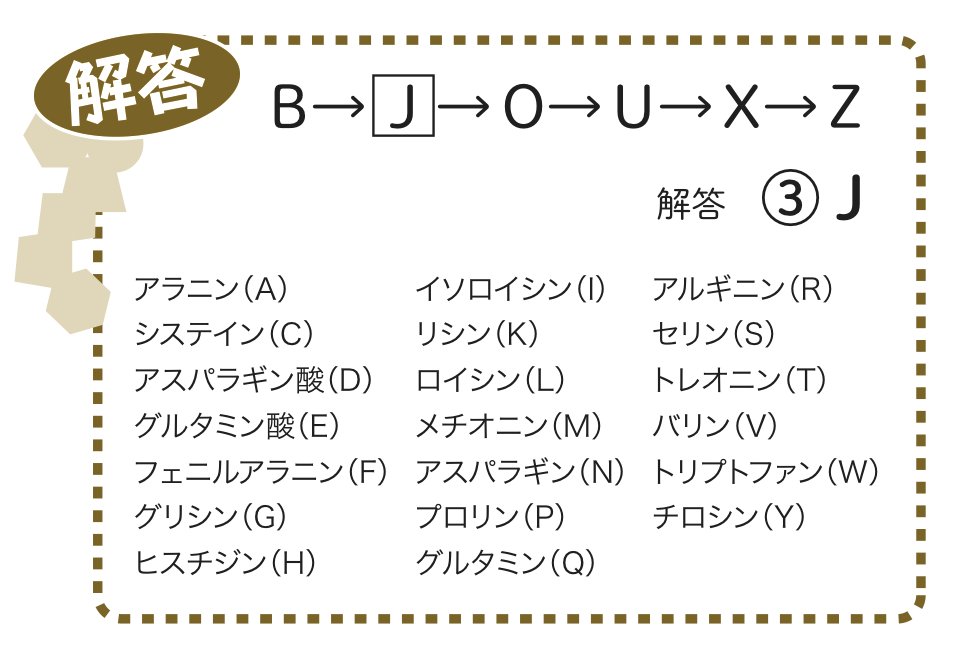 タンパク質を構成するアミノ酸(一部特殊なものを除く)20種類のアルファベット1文字表記に含まれない文字をアルファベット順に並べると,『?』にあたる文字は③の『J』となります.ひらめいてしまえば簡単に解けるヒラメキ問題.すぐわかったという方もいれば,全くわからなかったという方もいると思います.アミノ酸の1文字表記で使われている文字を取り上げるのではなく,使われて「いない」文字を考えるという少しひねった問題だったので,その辺りに気づくかどうかが分かれ目だったかもしれません.