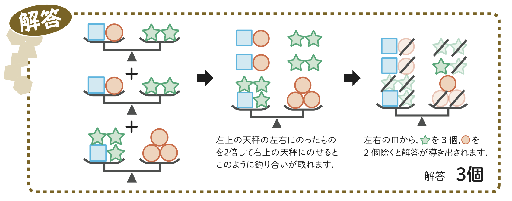 ●1つと★1つと釣り合う■の個数は『3個』です.問題はそれほど難しいものではなく,方程式を立てたら簡単に解けた,という方も多くいらっしゃると思います.ただ,せっかくなので,方程式を使わないパズル的な解き方を解答に記しておきました.ちなみに,重さの比を出すことができまして,今回の問題では■:★:●=3:4:5となります.