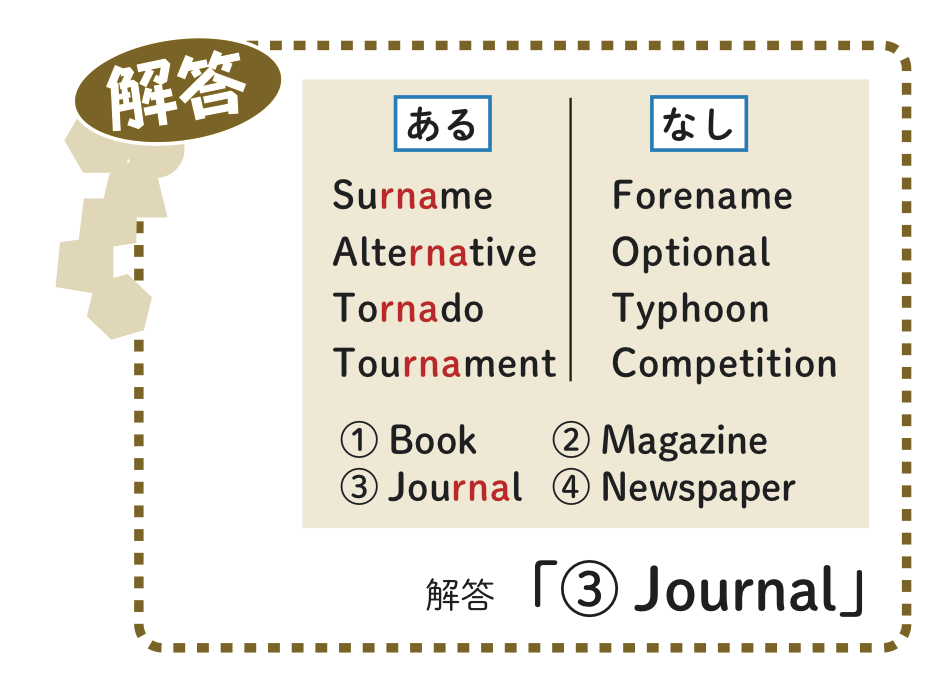 「ある」グループの単語のなかには「rna(RNA)」の文字列が含まれています.したがって,4つの選択肢のなかでrnaが含まれているのは「Jou“rna”l」ということで③が正解です.いつも解いてもらっている方のなかには,今回の問題も何か特集(先月号は「RNA修飾」)と関係があるのではと思った方もいたのではないでしょうか? そういう方は少しひらめき易かったかなと思います.
