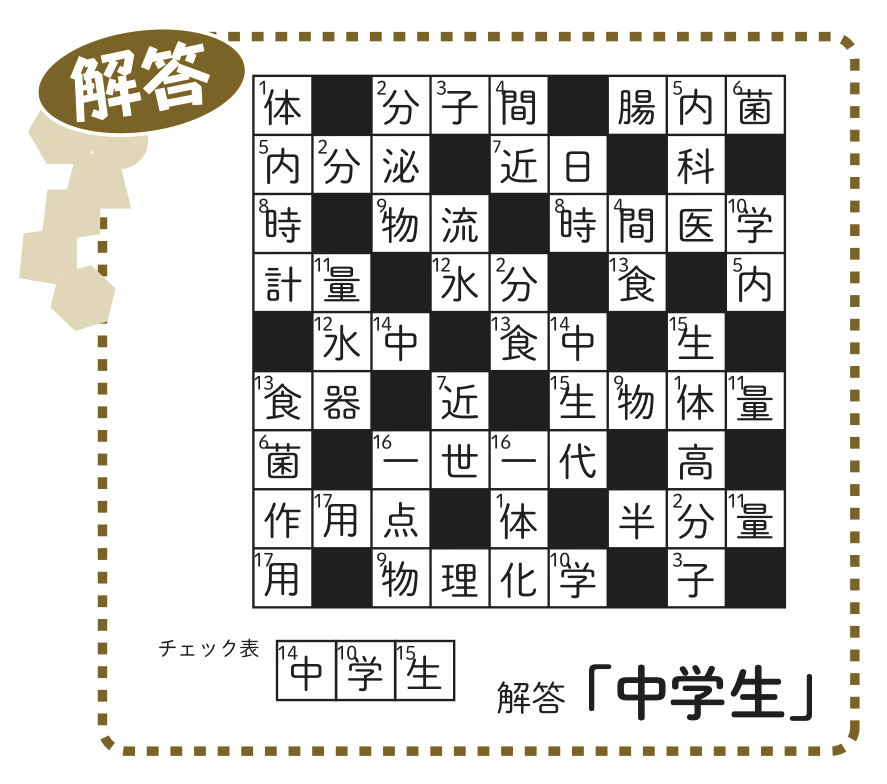 最初に手をつけていかれたのは,右上の「○科医」からでしょうか?「内科医」か「外科医」ですが,「腸外○」という言葉はないので5番に入る漢字は「内」とわかります.その後右上に移り,「内○泌」から2番が「分」…と順番に埋められていきます.「量水器」「生物体量」などがパッとは思い浮かびにくい単語ですが,それぞれ「水道メーター」「バイオマス」と言い換えればご存知かと思います.先月号の特集「時間医学(サーカディアン・メディシン)」という単語は,不勉強の僕にとってははじめて聞く言葉でしたが,盤面の右上に組み込んだので,そこを手がかりに解いていった方もいるかもしれません.他に,特徴的な箇所は中央下の「○世○代」で,○には同じ文字が入るのですが,これはもちろん「一」です.余談ですが,「一○一○」という四字熟語はとてもたくさんありまして,少し考えるだけで「一国一城」「一朝一夕」…と10個位はすぐに思いつくのではないでしょうか.辞書を調べると20個以上見つけることができます.パズル的には「一月一日」「一人一個」「一時一分」などもOKな気がしますので,そんなものを入れるとかなりの数になります.パズルをつくっていると,このような特徴のある熟語が気になったりする次第です.
