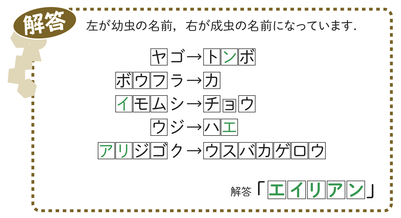 先月の『穴埋めクイズ』の答えはこちら.「左から右へ“変わる”」というヒントと,ちょうど真んなかの「□□□」を見て「ちょう」,そして幼虫→成虫の変化が思い浮かべば,答えまでもう一息です.上4つの組合わせはスムーズに埋まったかもしれませんが,5つ目の組合わせについては,知らなかった方もいるのではないでしょうか.すりばち状の巣をつくり,捕食をすることで有名な「アリジゴク」は「ウスバカゲロウ」の幼虫です.