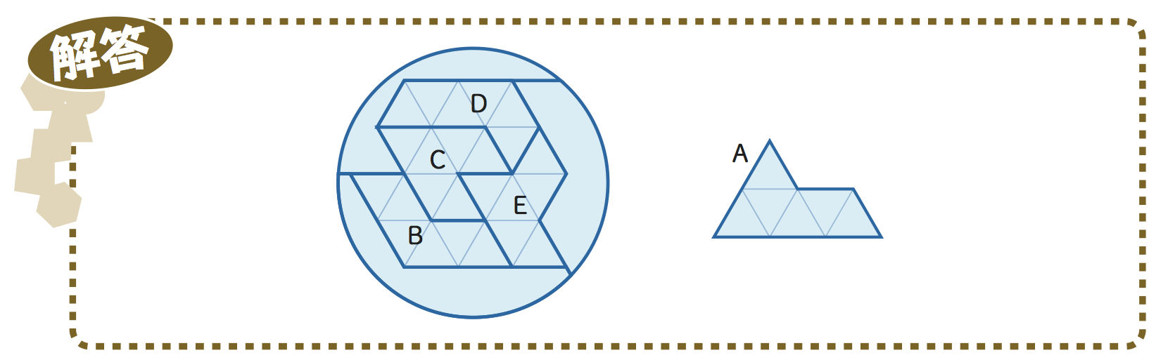中央の欠けている部分に,B,C,D,Eの4片を解答図にあるように入れると,復元完了です.よって,解答の使われなかった破片は「A」となります.