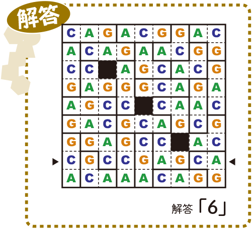 先月号の『CAGブロック』の答えはこちら.「ブロック分け」とか「Area Division」とよばれる昔からあるパズルで,分ける文字も自由に設定できます.今回は先月号の特集「リピート病」を調べていたときに「CAGトリプレットのくり返しの異常伸長に起因するトリプレットリピート病としてHuntington病などが有名」ということを知り,たくさんのCAGに分けてもらうパズルに仕立てました.解く道筋としては,まずは同じ文字同士が隣り合ったブロックの間に線を引き,そこから1マスや2マスが孤立しないように,うまくCAG3文字の入ったブロックができるように探りながら区切っていくことになります.うまくすべてを区切り終わり,矢尻の間にできる区切りの数を数えると『6』になります.
