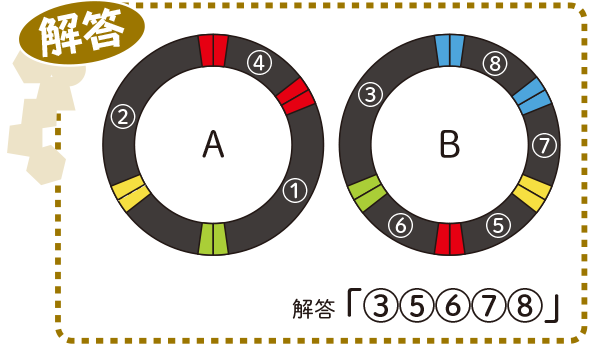 先月号の『プラスミドを復元せよ』の答えはこちら.パズルとしてはピース同士の繋がりを考えて組み合わせていく「マッチングパズル」とよばれるパズルの一種になります.解くにあたっては,青い切断面をもつピースが③⑦⑧の3つしかないことに注目.すべてのピースを使う問題なので,⑧のピースの両端には必ず③と⑦が繋がった形になることが決まります.次にその3ピースのセットに何が繋がるかを探っていくことで,AとB,2つのプラスミドを完成させることができます. Bを構成するのは『③⑤⑥⑦⑧』の5ピースでした.