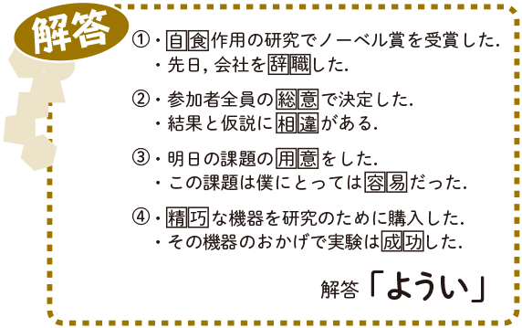 先月号の『公園で講演』の答えはこちら.先月号の特集テーマが「選択的オートファジー」ということを聞き,選択…洗濯(せんたく:例題に使用),自食…辞職(じしょく:①に使用)と浮かんだ次第.その結果,このような同音異義語を使った問題になりました.どちらかの文脈から入る熟語を想像し,その同音異義語が他の文脈と合うかを確かめていくと,順にわかってくると思います.②は総意と相違(そうい),③は用意と容易(ようい),④は精巧と成功(せいこう)ということで,50音順で並べたときに一番後ろになるのは,③の『ようい』となります.ちなみに,日本漢字能力検定協会によると「広辞苑」に採用されている言葉で一番多い同音異義語は「こうしょう」の48語だそうです.皆さんはいくつ思いつくでしょうか?