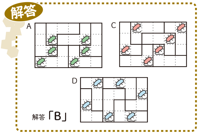 先月号の『細菌を分けよう』は楽しんでいただけましたか.L字型を組合わせた長方形で盤面を分けられるということに気づいて,サクサクと分けることができた問題もあったのではないでしょうか.長方形だけでは分けられない盤面もあり,その場合は,さらに試行錯誤していただくことになります.結果,盤面B以外の,A・C・Dの盤面は解答例のように分けることができますので,答えは『B』となります.本問でも使った,正方形4枚をつなげたL字型はパズルとの相性が非常によい形状で,いろいろなパズルのネタになってきました.本連載内でも「L字型のマイクロピペット」を使ったパズルを2019年10月号に出題しています.これまでの本連載のパズルは,すべて羊土社のweb上でご覧いただけますので,最近パズルコーナーを知ったという方で興味のある方は,ぜひ挑戦してください.
