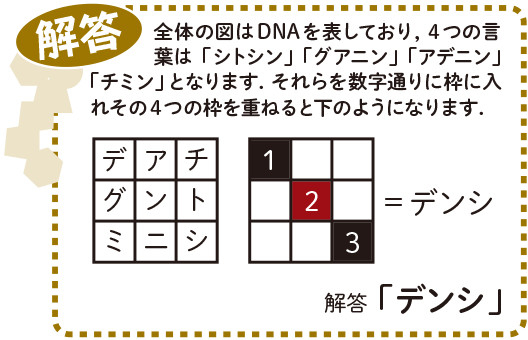 先月号の『生命の謎を解け』は楽しんでいただけましたか.とりあえず,図式化されたものが何かということについては,皆さんは迷わなかったのではないでしょうか.全体は「DNAの二重らせん」をイメージしました.となると,4つあるものは塩基名であることが想像できます.どの枠がどの塩基に対応するのかという点は,中央の…が水素結合を表すことに気づけば,水素結合3本の上2つが「シトシン」「グアニン」,結合2本の下2つが「アデニン」「チミン」であることがわかります.最後に,数字の順に枠に文字を入れて,4つの枠を重ねると,枠内の9つの文字が判明し,それらを使って?の図式を読むと「デンシ」となります.先月号のテーマが「バイオDX」ということで,バイオデータの基本となる塩基情報を使って,電子(データ)を浮かび上がらせるように作ってみました.