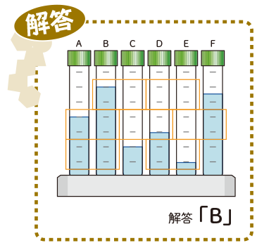 先月の『6本の遠沈管』は,楽しんでいただけましたか? いつもいろいろなものを壊してそれを 復元してもらう図形パズルですが,今回は実際の遠沈管ではなく,あくまで遠沈管が入っている場面を切りとってパズルに仕立ててみました.最初の手がかりは,Fの遠沈管で,空いている箇所は必ず液体が満たされていることになります.よっ てそこに入るピースは4ピース.ここで「3ピースでは?」と思った人は,見事に僕の罠にはまっています.よくピースを見ていただくと,7つのピースのうち,液体が満たされている1本と空の1本が組合わさっている1ピースだけが,180度 回転させてはめることもできるピースになっていますね.ということで,この罠に気づかないと,試行錯誤しても一向に答えの配置が見つからないことになります.この罠をクリアすると,あとは,Cの2カ所はどちらも空になるなどのヒントを頼りに,解答のような形にはまっていきます.結果,一番液量の多い「B」が正解となります.