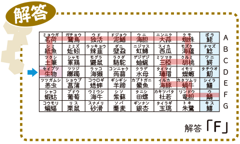 先月の『生き物しりとり』は楽しんでいただけましたか? かなり漢字が得意な方でも,すべてが読めることはなかったかと思いますので,ある程度,辞書やネットで調べながら進めていくことになったかと思います.ですが,そもそも漢字がわからなければ調べられない…という辺りで,苦労された方も多いのではないでしょうか.スタートの「生物(せいぶつ)」からは上の「土筆(つくし)」,右の「躑躅(つつじ)」,下の「恙虫(つつがむし)」の3方向とも動けるので,どこか1つに決めて,その先を探っていくことになります.「躑躅(つつじ)」は次が「軍鶏(しゃも)」「海獺(らっこ)」「菖蒲(しょうぶ)」と,どれも続かないので終了.このように探り探りで進んでいくと,「土筆(つくし)」からの道が右端まで抜けられる道筋となります.最後は「鷠(う)」ということで,「F」が答えとなります.ここまではスタートから探っていく正攻法を書きましたが,この手の問題は,ゴールから探るのが解答への近道であることも多いです.今回も,ゴールの魚偏の漢字7個のうち,1つ戻れるのが「鷠(う)」と「鱚(きす)」だけで,「鱚(きす)」もすぐに戻れなくなることがわかるので,あとは,「鷠(う)」から逆に辿っていくと解答になります.