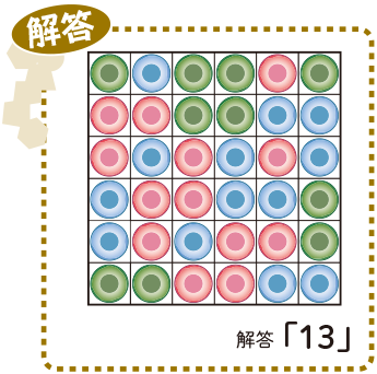 先月の『3種の細胞』は楽しんでいただけましたか? 先月号の特集テーマは「クローン進化と疾患発症」でしたので,3種類の細胞が集団をつくっている様子をイメージしてパズルを考えました.「3つの連続するマスが『すべて同じ』や『すべて違う』となってはいけない」というルールを,いかにうまく理解して使いこなせるかが鍵となります.今回のパズルでは,4マスの並びを考えることが手掛かりの一つです.例えばABCの3種が,「A?AB」という順で並んでいると,「?」に入るのは「B」になります.「AB?C」という順でならんでいたら,「?」に入るのは必ず「B」になります.見逃しやすい,ナナメの並びも気にかけながら,わかるところからゆっくり埋めていきましょう.最後の頃は,ルールにもすっかり慣れて,ヒントも多くなるので,どんどん盤面が埋まっていく爽快感を味わえたかと思います.すべて埋めたあとの赤い細胞を数えて,「13個」が答えとなります.本連載では初出のルールがあるパズルには,必ず例題をつけるようにしています.そのようなパズルはまず例題を解いてみて,自分なりにパズルの解き筋を見抜くのが大切になってきます.結果が明らかであるところで自分の手法を確認する作業は,コントロール実験と似ているかもしれませんね.