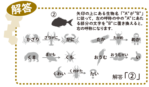 先月の『クマがクモに?』は楽しんでいただけましたか? 与えられた図式から,そこにある法則を探っていくヒラメキ問題でした.タイトルに含めましたが,左下の図式の「くま」→「くも」が一番の手がかりになるかと思います.そのヒントから,「ま」が「も」になっているなぁ……「ま」が「も」,つまり矢印上のイラストは「まがも」であり,左右のイラストの生物名の変換方法をあらわしていると気づければ解明の第一歩.右下の図式は真ん中が「おうむがい」ということで「おうむ」が「い」になっていることも確認したら,解けたも同然です.あとは解答の図式が「くわい」を「くわがた」(「くわ」が「た」)で変換し「たい」になることがわかったら,4つの選択肢のなかでは「②」が正解であるとわかると思います.ちなみに,左上は「かざり」を「ざりがに」で変換して「かに」,右上は「たか」を「たがめ」で変換して「めか」が意図解でした.正解にたどり着いた方も,この2つまでしっかり意図解にたどり着いたという方は少なかったかと思います.