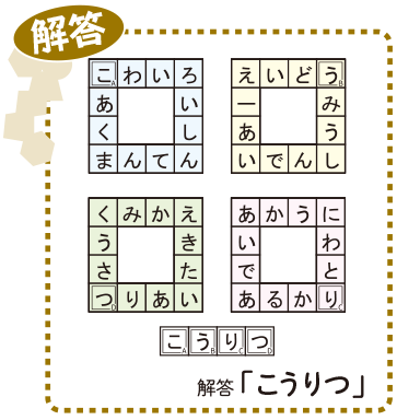 先月の『4文字言葉つなぎ』は楽しんでいただけましたか? カギなしの小さなクロスワードということで,中央の2文字を手掛かりに,思いつく言葉をどんどんあてはめていくことになります.水色の問題で上のヨコ読みだと「?わい?」から,「かわいい」や「ほわいと」などが最初に思いつく候補になるでしょうか.1つ思いつくと,それにつながる単語があるかないか,とさらに頭をひねる…という感じで,うまくつながる4文字の言葉4つができたら,1問完成です.とにかく思いついた単語をどんどんあてはめていって4問とも完成させると解答のようになります.
