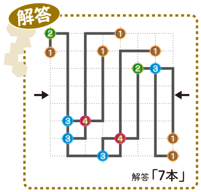 先月の『神経回路を完成させよう』は楽しんでいただけましたか?「イチマガ」とよばれているパズルを,神経細胞のつながりに見立てての出題となりました.最初は少しルールの理解が難しいパズルだと思いますが,例題を何度か解いてみて,試行錯誤してみると慣れてくると思います.「4」の細胞の周りには,各方向に1マスずつ線が伸ばせる,「1」同士が隣り合っているところでは「1」の細胞同士はつなげられない,などという,基本的なところから解き進めていくことになるかと思います.2つの細胞同士を結ぶのが1本の線のみというわけでなく,複数の違う経路で結ばれることもあるというのが,このパズルのおもしろいところです.そんなつながりの様子も神経細胞に似ているのではないかと思い,モチーフとパズルの親和性に,一人ほくそ笑んでいたしだいです.結局は,試行錯誤しながら進めてもらうことになるのですが,すべてがつながると解答図のようになります.最後に,矢印の間の線の数を数えた「7本」が答えとなります.