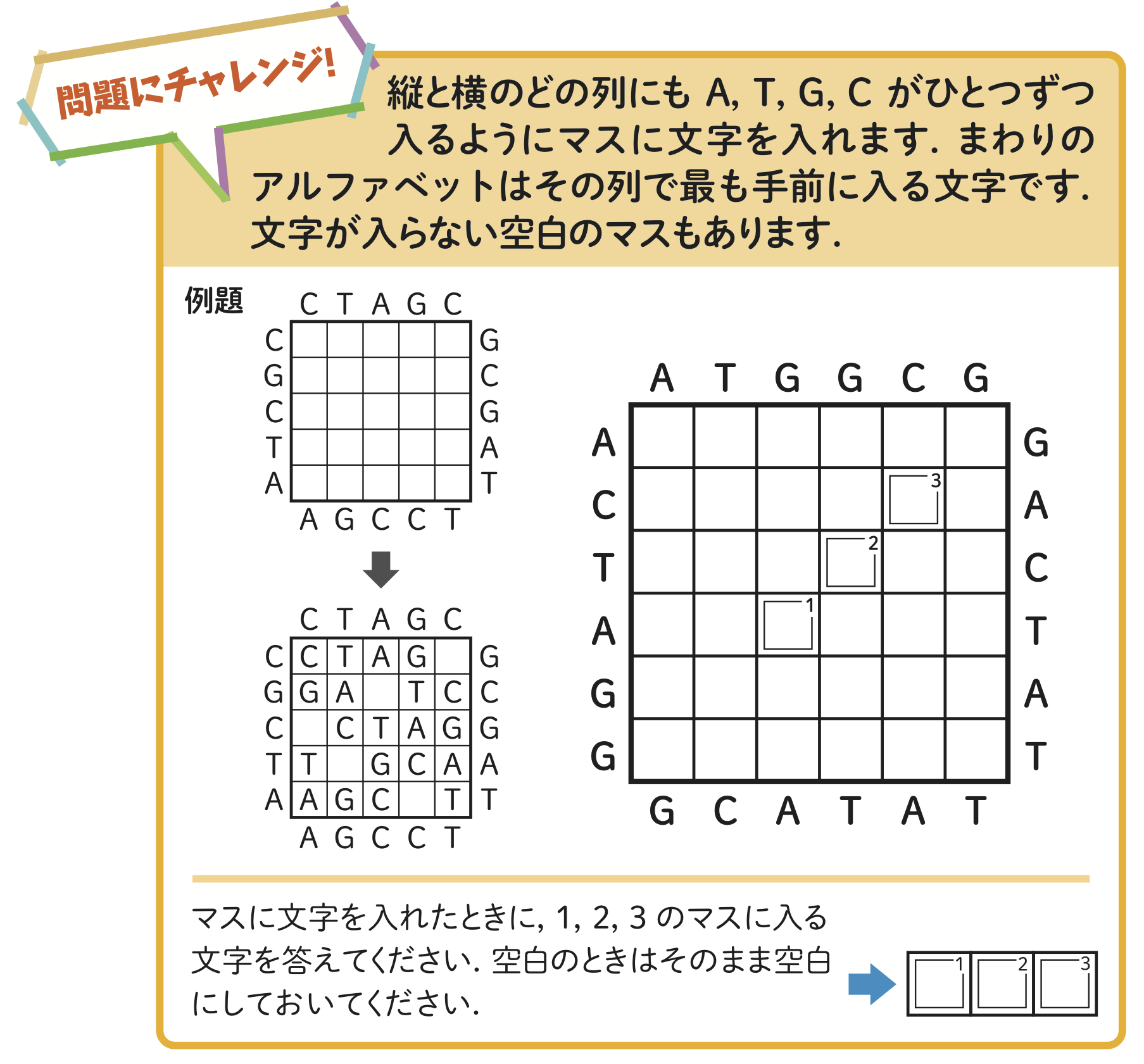 オリジナルのパズル名は「ABCプレース」といいまして,A~CやA~Eのような文字を入れていくパズルです.ABCに限らず,どんな文字でも成立しますので,皆さんが慣れ親しんでいるATGCの4文字を使って問題をつくりました.数独と似ているようですが,解き味はかなり違います.はじめて解く方には少し難しめの問題かもしれませんが,ヒントとなるまわりのアルファベットを利用しながら,外側のマス目から埋めていってください.