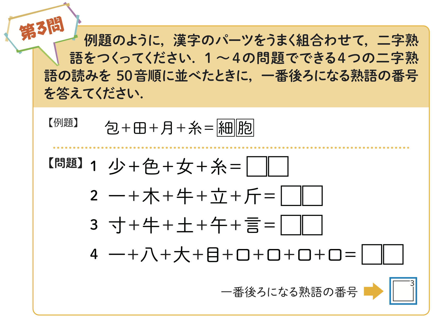 3問目は文字パズルから,2018年10月号掲載「二字熟語を復元せよ!」からです.