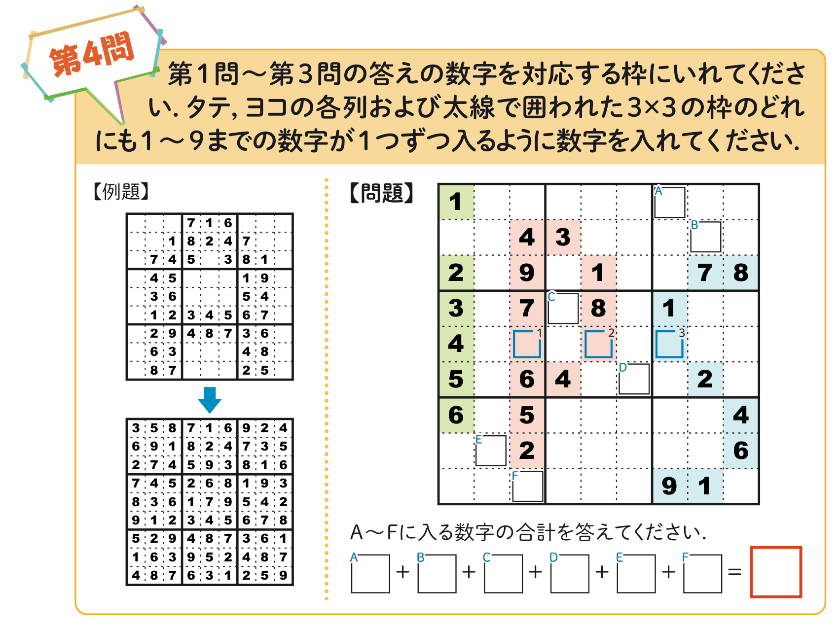 パズルリレー最後の4問目は,2017年11月号掲載「HSC de ナンプレ」からナンバープレースです.今回は「iPS de ナンプレ」ということで,iPS の文字を問題に組み込んであります.これまでの3問の解答を盤面に入れてから解きはじめてください.