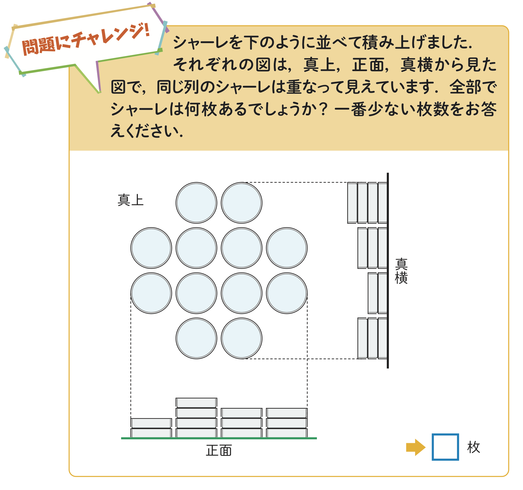 机の上にシャーレを積み上げて並べる.それを横から覗いて数を数える.そんな風景もパズルになります.図のように見える並べ方をいろいろ考えてみてください.
