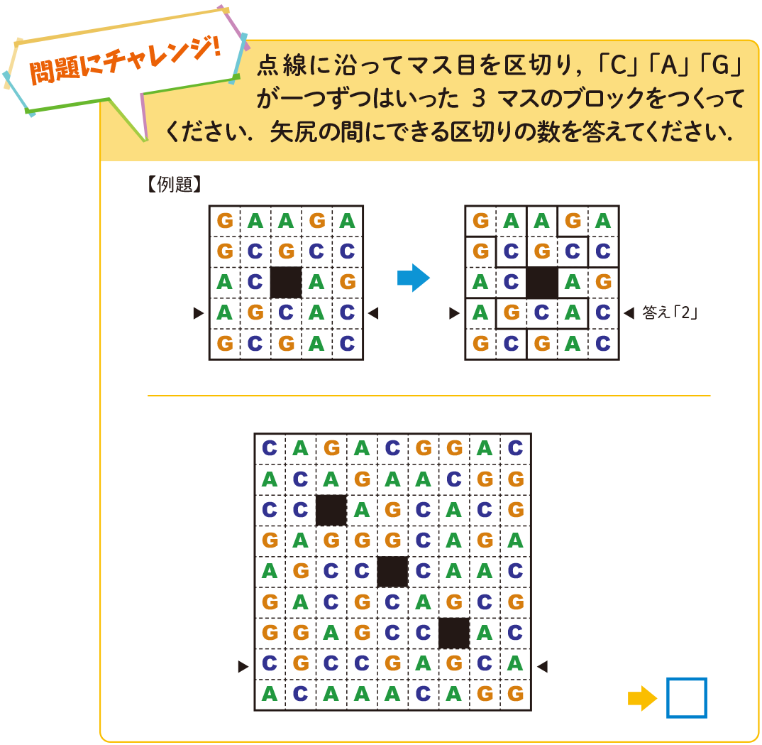 点線に沿って区切りを入れ,正方形の盤面を「CAG」からなる3マスごとのブロックに分けてください.同じ文字は違うブロックに入るので,まずは同じ文字同士が隣り合っているところに線を書いて区切ることからはじめるとよいでしょう.