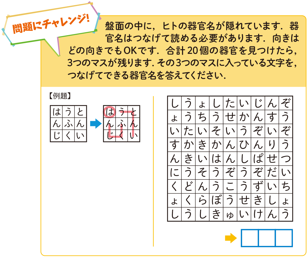 上の盤面の中から,20個の器官名を探しだしてみてください.1文字~6文字まで,どちらの向きにつないでも大丈夫です.