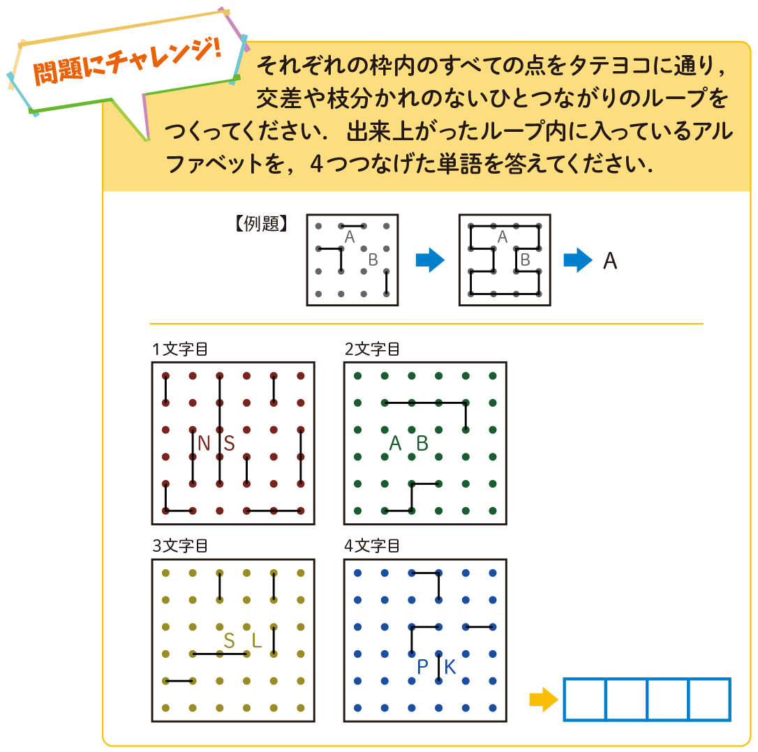 与えられたヒントの線を使いながら,すべての点を通るひとつながりのループをつくるのが目的です.それぞれの枠内でループのなかにあるアルファベットを1文字ずつ選んで,つなげて単語をつくってください.