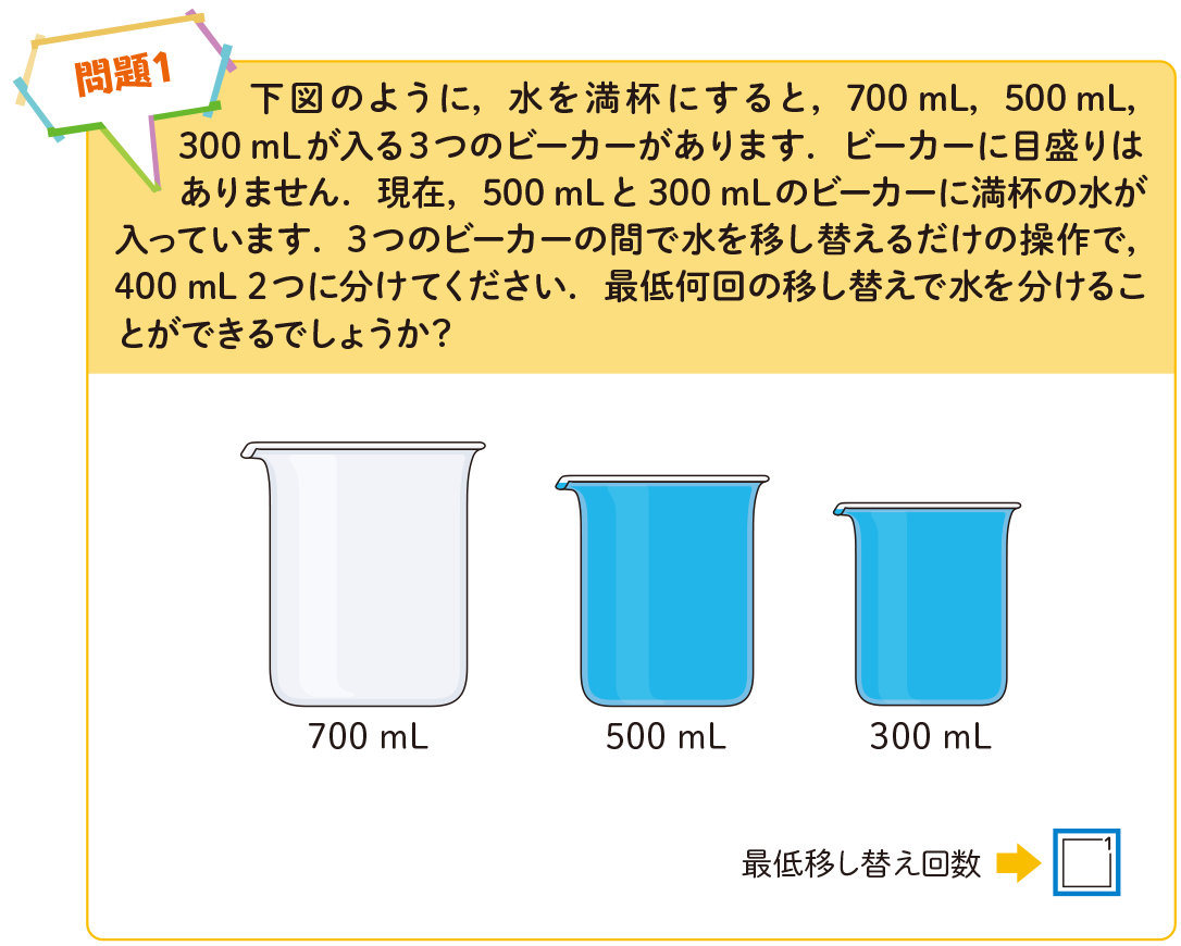 1問目は2020年11月号「3つのビーカー」からです.3つのサイズの違うビーカーを使って,目的の水量にしてください.