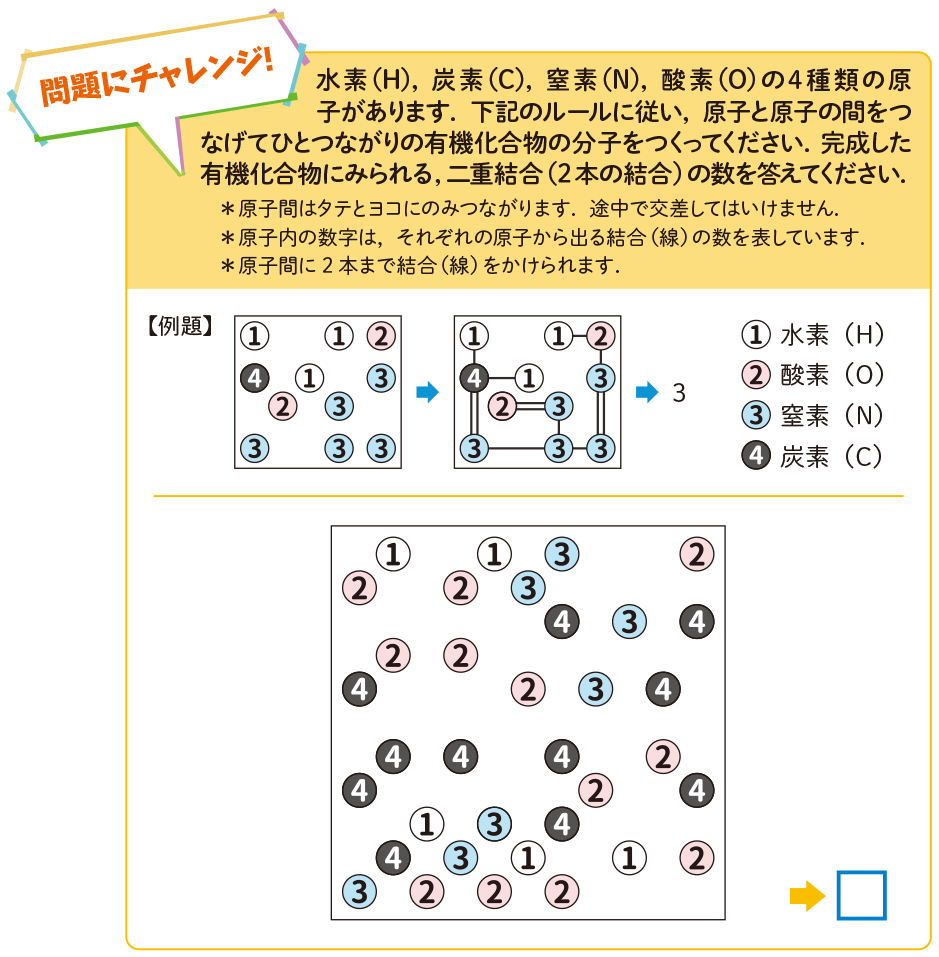 今月は,一つずつ書き加えて解答していくペンシルパズルからの出題です.4種類の原子がルールに従ってつながっていきます.水素からは手が1本,酸素からは2本,窒素からは3本,炭素からは4本出ているイメージです.分子の完成していく様子を想像しながら,すべての原子を一つにつなげて,有機化合物の分子を完成させてください.