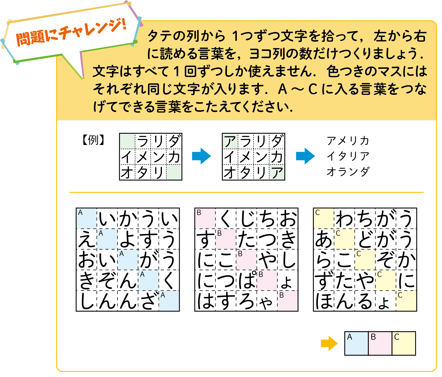 6月号の「文章を復元せよ!」に続いて,文字を拾っていくタイプのパズルです.5つの5文字言葉が1文字目,2文字目…と分けられ,ばらばらになっています.欠けている共通の文字を推測しながら,各問題の5文字の単語5つを読みとってください.