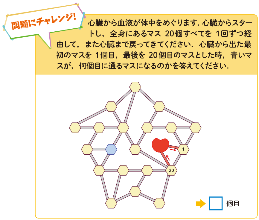 今回は,全身をめぐる血液をモチーフに使ったパズルです.心臓から出発して,すべてのマスを巡りまた心臓まで戻る道筋を見つけてください.実際の血液だったら,すべての道に一気に流れ込めばいいのですが,そこはパズルということで….一度通った道を二度通ることのないよう,マスを1個ずつ,順番に巡ってください.