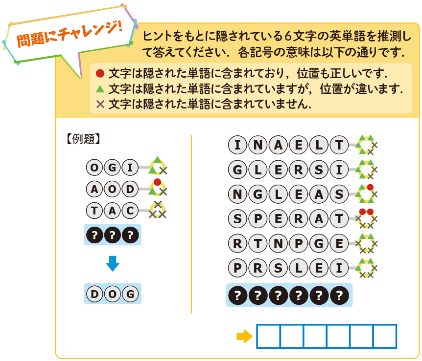 今回の問題は論理パズルの部類に入るかと思います.与えられたヒントから,条件に合う文字やそれらの並びを推測して,6文字の単語を復元してください.記号の数はその記号に相当する文字の数を示しています.どのように進めていけばよいのかは,例題を解くことで確認できます.与えられた条件から,論理的に解答の単語「DOG」を導ければOKです.