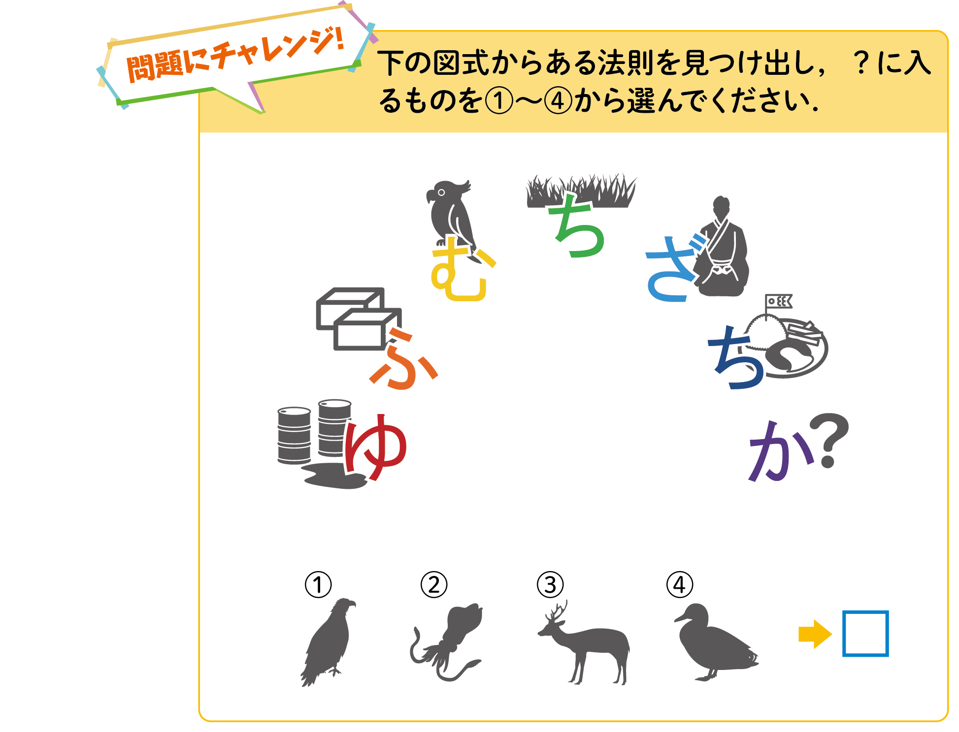 1年ぶりのひらめき問題です.イラストが何をあらわしているか考えて,そばに書かれている文字との関係を探ってみてください.イラストや文字の並び方もヒントになるかもしれません.