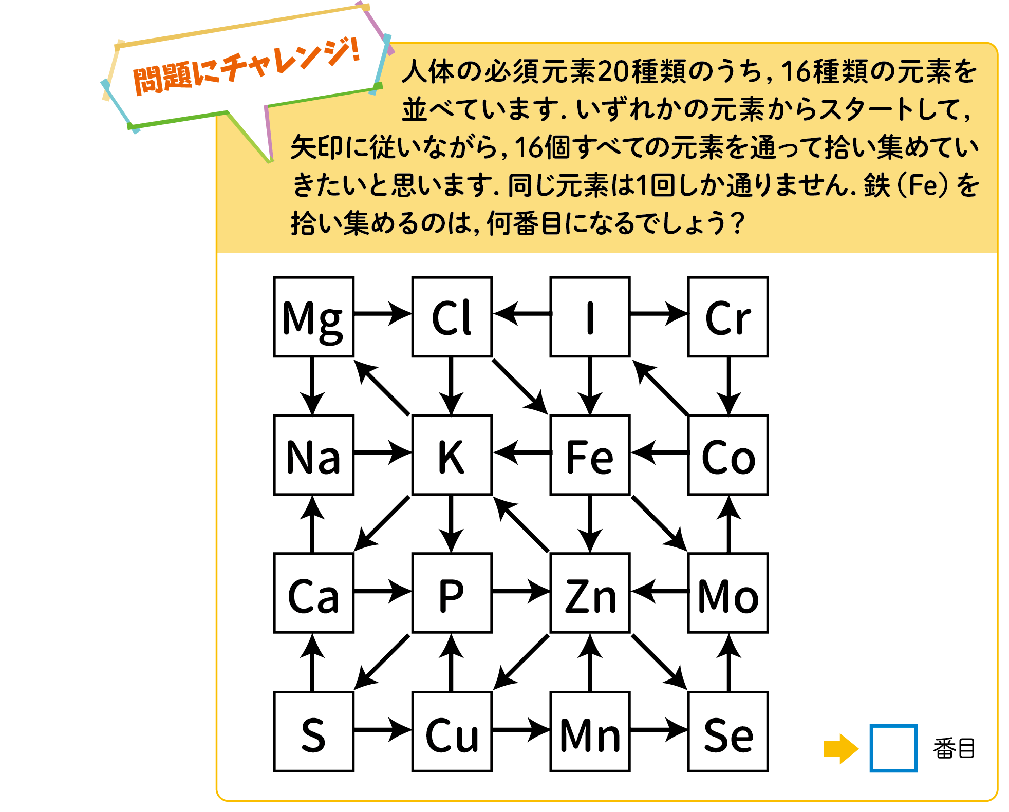 矢印に従って,16個すべてのマスを巡り,元素を拾って回ります.ループをつくる必要はなく,最初の元素から最後の元素まで1本の道でつなげることをめざします.どこがスタートか,どこがゴールかを見つけ,すべてのマスを通る道をうまく見つけてください.