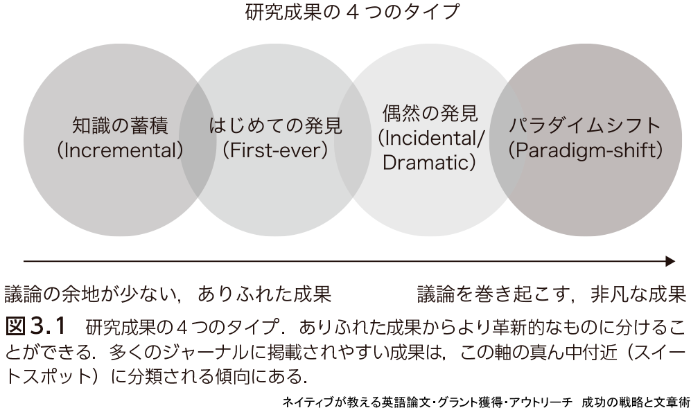 研究について書きはじめる時,ここで紹介した研究成果の4種類のカテゴリーを頼りにして「だから何?(So what?)」「誰が知りたい?(Who cares?)」という質問に答えられるか確かめておくべきである.もしこれらの質問に答えられないならば,たとえ手堅く行われた研究であっても,先々には煉獄行きに等しい苦難が待ち受けているだろう.もし研究提案や原稿を書きはじめる時にこれらのカテゴリー分けを無視してしまうと,編集者や査読者はどちらも,掲載するに値する新規性があなたの研究にあるか判断できないからである.また,カテゴリーに当てはめる時には,中心の2つのカテゴリー,すなわち「はじめての発見」タイプか「偶然の発見」タイプのどちらかを狙って考えていくべきである.もし,研究をこれらのカテゴリーに当てはめることができれば,インパクトファクターの高いジャーナルに論文が掲載されるか,研究費を受け取れる可能性が高まるだろう.さらに,プライミング効果や新近効果の恩恵にあずかるためにも,論文原稿や申請書を書いていく時には,研究成果のカテゴリーを念頭に置いておくべきである.このことについてはChapter 4,Chapter 5で触れる.そして最後に,研究成果が価値の高いカテゴリーに当てはまった場合,プレスリリースや所属機関のメディアリレーションズや広報の関連部署を活用して,自身の研究を宣伝すべきである.だがこのような部署は,比較的少人数で多くの仕事を回しているところがほとんどであるため,自身の力でうまくプレスリリースを活用したり宣伝をしたりすることで,マスメディアで報道してもらえる可能性を高めることができる.また,所属機関のメディア関連のスタッフが,研究成果が発表された文脈や研究の巧妙さについて理解してくれることはほとんどないため,プレスリリースを出す時は,その最初の原稿だけでも,その部署のスタッフに任せずに自分で書く方がいいだろう.プレスリリースについては,Chapter 7で解説する.