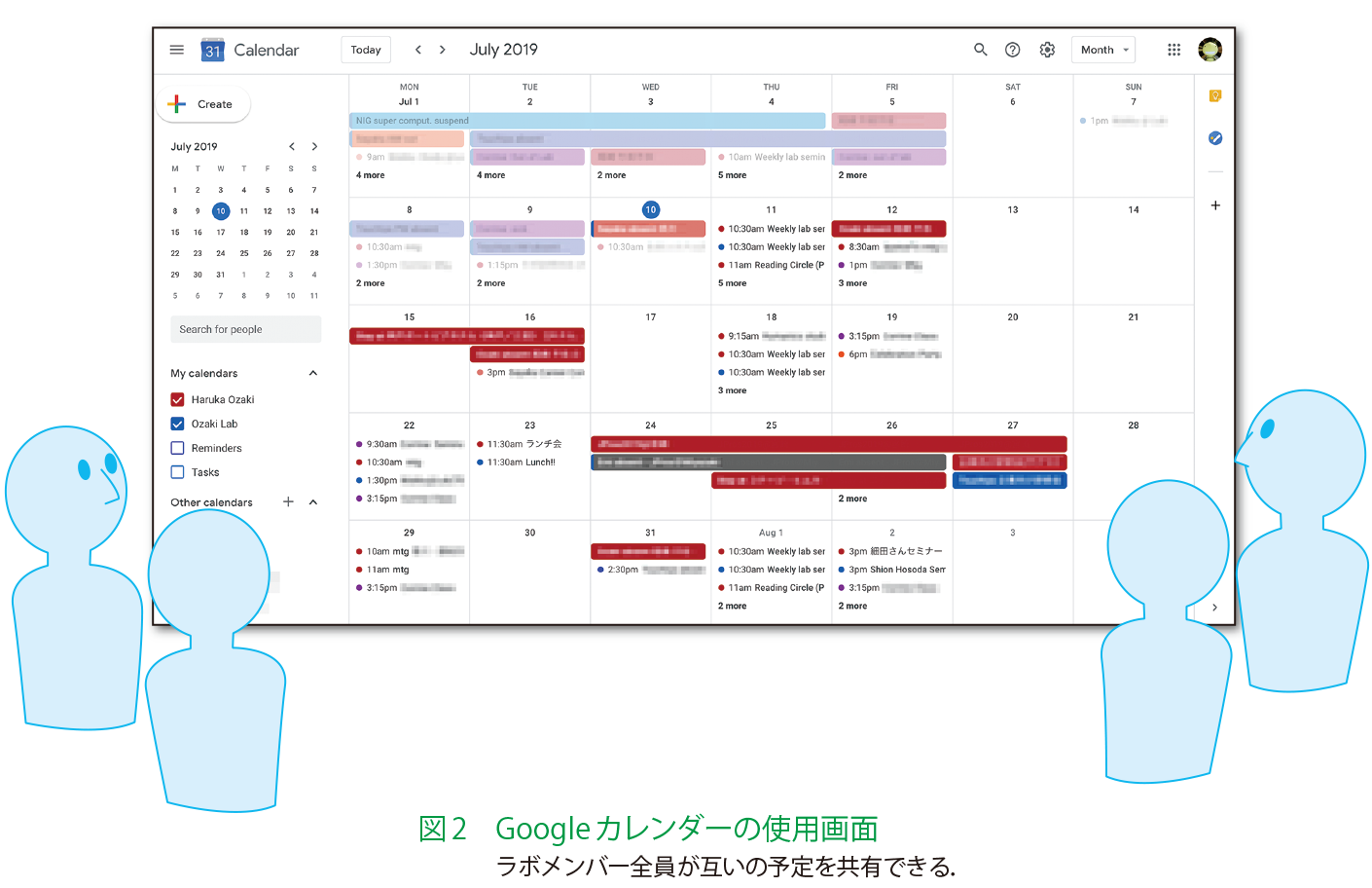 また,同期的なコミュニケーションの際には,どうしてもあらかじめお互いの予定をすり合わせる必要があります.そのときに地味に便利なのが,Googleカレンダー(図2)でのラボメンバーの予定の共有です.あらかじめ自分の予定や集中したい(話しかけてほしくない)時間を示しておけば,ミーティングや技術指導といった複数人が予定を合わせる際に,事前に相手が空いていそうな時間を知りたいときに確認することができます.