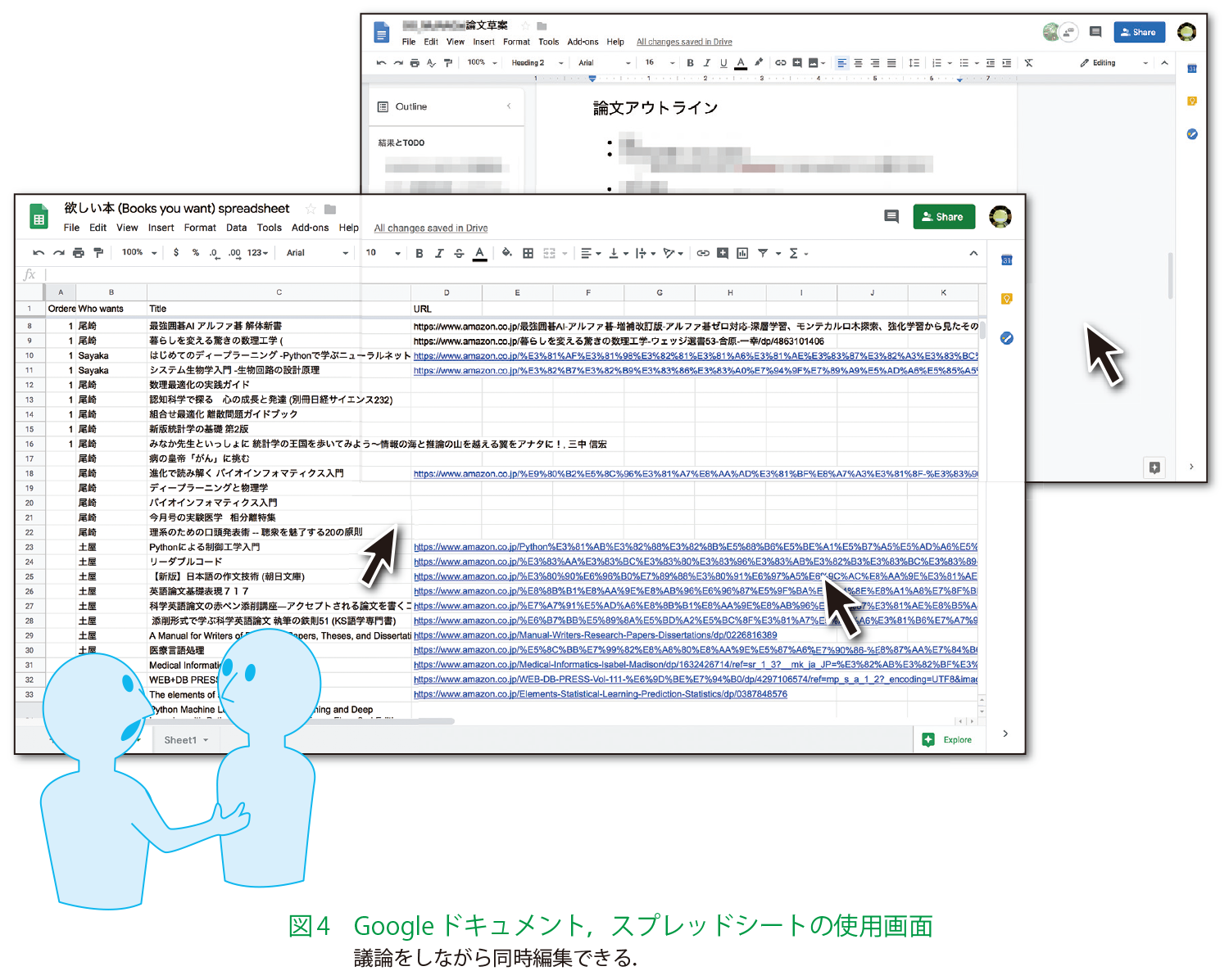 また,メンバーが購入したい書籍や物品などをGoogleスプレッドシート(図4)に書いておいてもらうようにしています.弊研究室ではここにリストアップされた物品を,責任者が判断して定期的に発注しています.これにより,メンバーがPIの居室に出向き,いちいち許可を求める必要がなくなります.Googleスプレッドシートは,ウェット実験が主軸の研究室においても,共通試薬や備品の管理などに使えるのではないでしょうか.