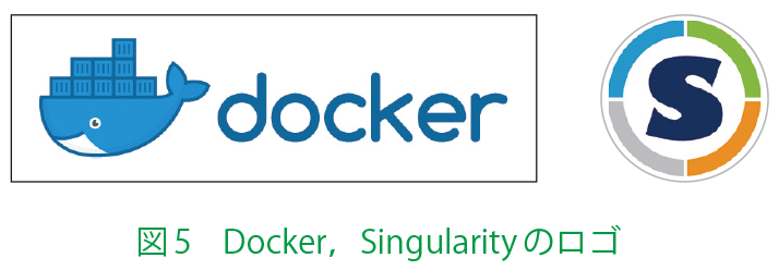 これらの問題を解決するのが,コンテナ技術です.コンテナ技術では「イメージ」というものをつくることで「他のシステムと分離された特別な状態のプロセス」をいつでも実行できるようになります.コンテナ技術としてはDocker(図5左,https://www.docker.com/)やSingularity(図5右,https://sylabs.io/ singularity/)が有名です.コンテナ技術を使うことにより,すでに使いたいソフトウェアがインストールされている「イメージ」が存在すれば,インストールなしでいつでもそのソフトウェアを使えるようになります.