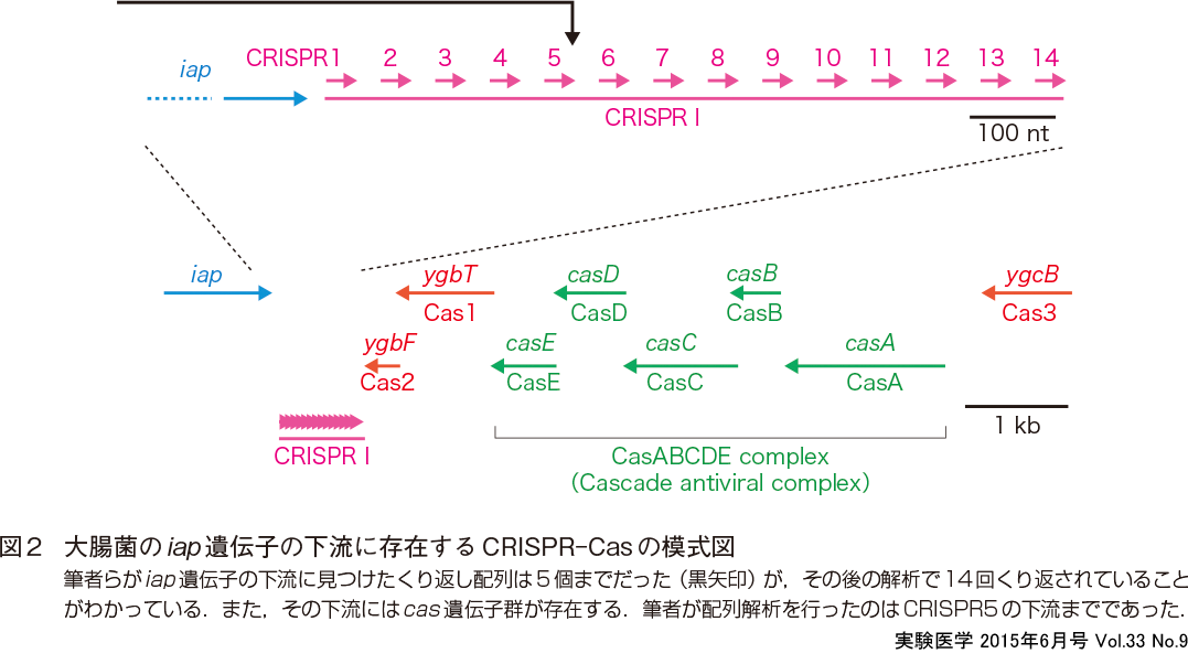 このくり返し配列の意味がわからないまま,筆者はポスドクとして1987年8月にYale大学へ赴任した.頭のなかはすっかりアメリカでの研究生活のことで一杯になっていた.はじめて経験する海外での生活のセットアップと,そこでとり組むtRNA依存Glu-Gln変換機構の研究テーマのことで考えることが多く,全く余裕のないときに,iap遺伝子の論文がJournal of Bacteriologyに受理された知らせをいただいた.これが今,頻繁に引用していただいているCRISPR発見の論文である3).論文が受理されたときは,はっきりと気持ちが元気になり,頑張って新しい研究テーマを進めようと活気づいたことを思い出す.しかしこの論文のDiscussionで記載されている奇妙なくり返し配列のことは,そのときも,またその後も忘れてしまっていた.中田先生はその後,この配列が大腸菌のゲノムのなかでさらに続き,合計14回くり返されること (図2),またこのようなくり返し配列は大腸菌のゲノム中にもう一カ所存在すること,さらに,これがサルモネラや赤痢菌にも存在することを確かめられて発表された6).