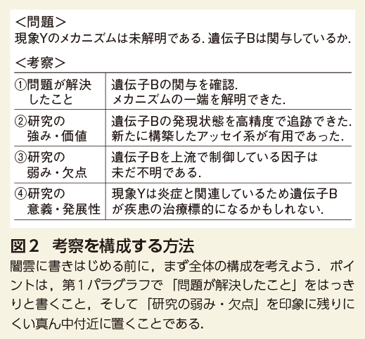 では実際に,考察全体の構成を考えてみよう.まずは図2のように,記載すべき項目を短い文章でまとめよう.
