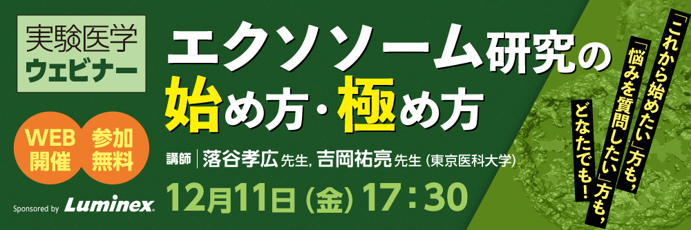 今回は,細胞-細胞コミュニケーション,バイオマーカー,機能性成分などの研究で検討不可避な存在となった「エクソソーム(EVs)」をテーマに,分野のトレンドはもちろん,これからエクソソーム研究を始めるには? といったここでしか聞けない情報をトップランナーにレクチャーいただきます.