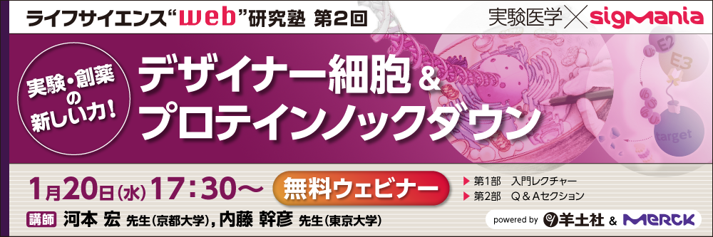 第2回は細胞の機能解析手段として,また創薬モダリティとして注目の「デザイナー細胞」と「プロテインノックダウン」の2つの技術を1度に学べる,見逃せない内容です.今回も入門レクチャーと視聴者のお悩みを解決するQ&Aの2部構成で開催しますので,皆さまのご研究にぜひお役立てください.