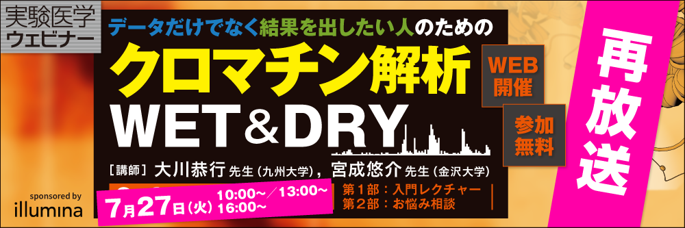 先月6月23日開催のウェビナー「データだけでなく結果を出したい人のためのクロマチン解析 WET&DRY」では,450名を超える皆様にご参加申込いただき,『本には書いていないことが知れた』『初心者にも分かりやすかった』といった好評の声とともに,多数の“再放送希望”をいただきました. そこでこのたび,1日限定の録画配信を開催いたします.